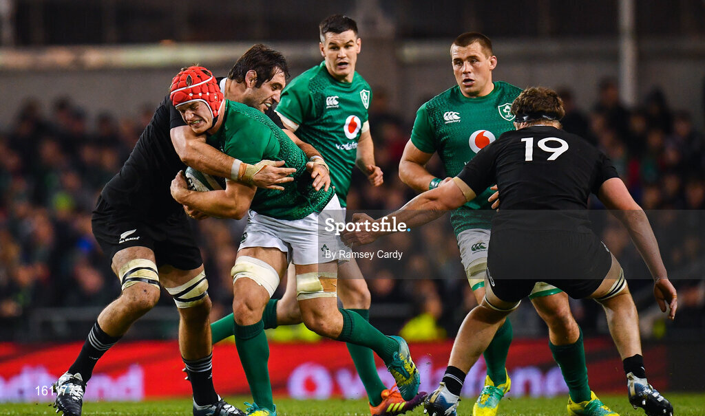 17 November 2018; Josh van der Flier of Ireland is tackled by Sam Whitelock of New Zealand during the Guinness Series International match between Ireland and New Zealand at the Aviva Stadium in Dublin. Photo by Ramsey Cardy/Sportsfile