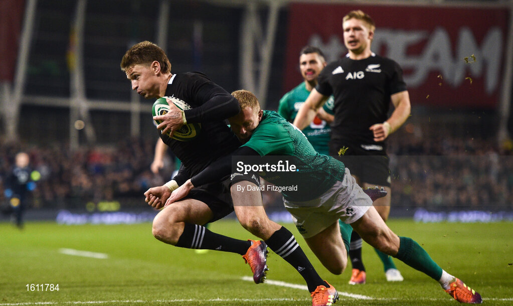 17 November 2018; Beauden Barrett of New Zealand is tackled by Keith Earls of Ireland during the Guinness Series International match between Ireland and New Zealand at the Aviva Stadium in Dublin. Photo by David Fitzgerald/Sportsfile