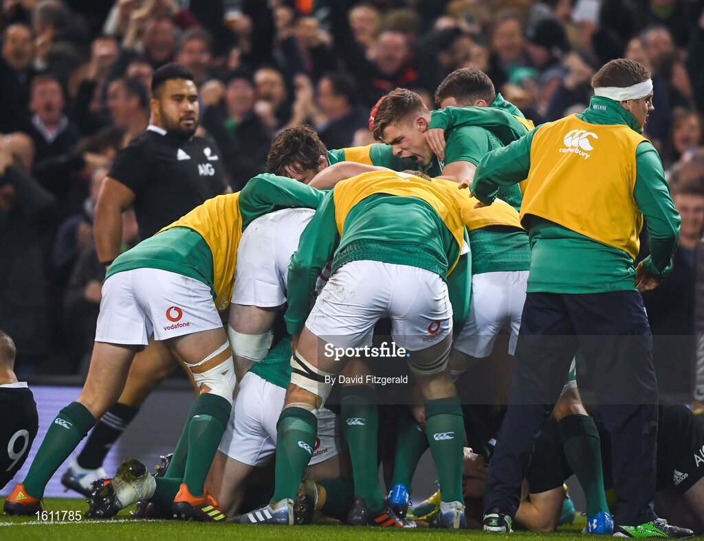 17 November 2018; Jacob Stockdale of Ireland is congratulated by team mates after scoring his side's first try during the Guinness Series International match between Ireland and New Zealand at the Aviva Stadium in Dublin. Photo by David Fitzgerald/Sportsfile