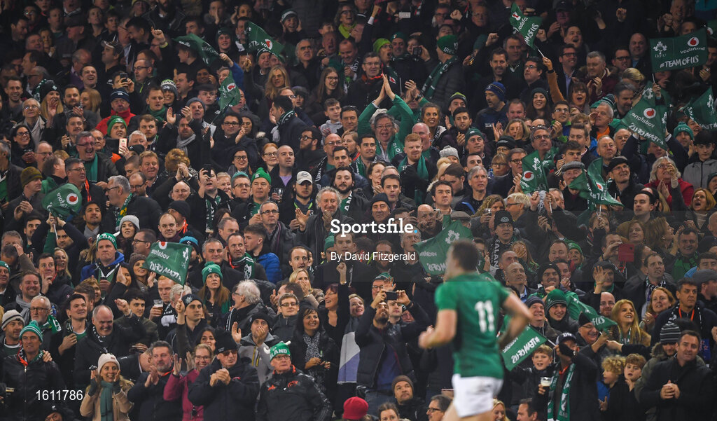 17 November 2018; Ireland supporters celebrate the try scored by Jacob Stockdale during the Guinness Series International match between Ireland and New Zealand at the Aviva Stadium in Dublin. Photo by David Fitzgerald/Sportsfile
