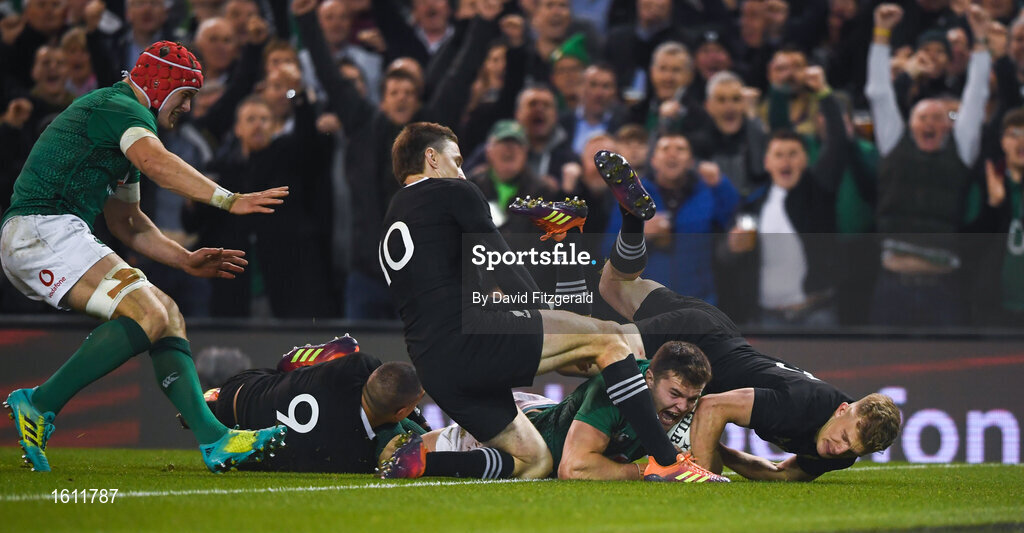 17 November 2018; Jacob Stockdale of Ireland scores his side's first try during the Guinness Series International match between Ireland and New Zealand at the Aviva Stadium in Dublin. Photo by David Fitzgerald/Sportsfile