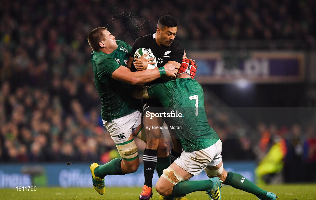 17 November 2018; Richie Mo'unga of New Zealand is tackled by CJ Stander, left, and Josh van der Flier of Ireland during the Guinness Series International match between Ireland and New Zealand at the Aviva Stadium in Dublin. Photo by Brendan Moran/Sportsfile
