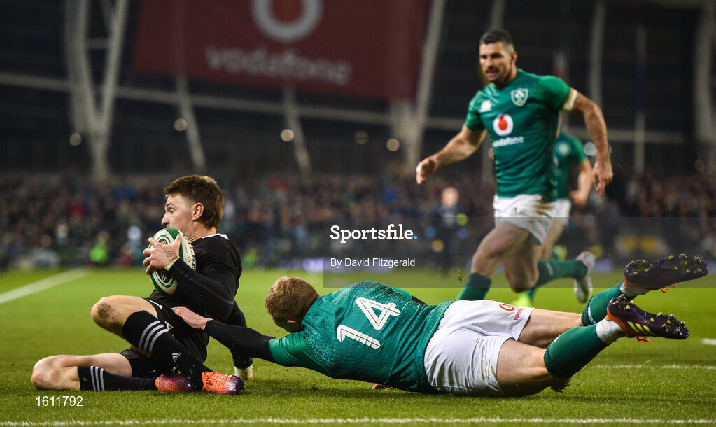 17 November 2018; Beauden Barrett of New Zealand is tackled by Keith Earls of Ireland during the Guinness Series International match between Ireland and New Zealand at the Aviva Stadium in Dublin. Photo by David Fitzgerald/Sportsfile