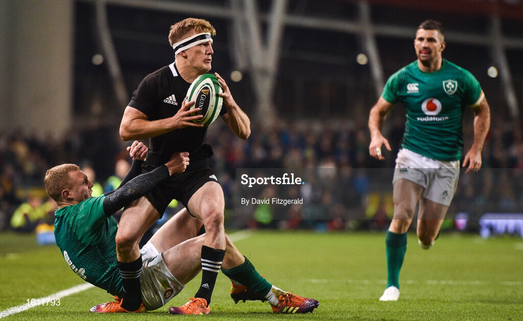 17 November 2018; Damian McKenzie of New Zealand is tackled by Keith Earls of Ireland of Ireland during the Guinness Series International match between Ireland and New Zealand at the Aviva Stadium in Dublin. Photo by David Fitzgerald/Sportsfile