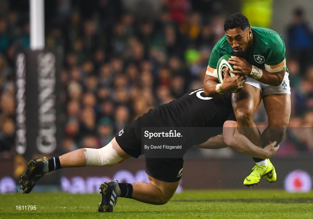 17 November 2018; Bundee Aki of Ireland is tackled by Beauden Barrett of New Zealand during the Guinness Series International match between Ireland and New Zealand at the Aviva Stadium in Dublin. Photo by David Fitzgerald/Sportsfile