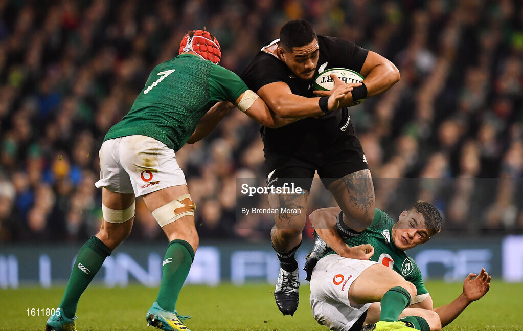 17 November 2018; Ofa Tuungafasi of New Zealand is tackled by Josh van der Flier, left, and Garry Ringrose of Ireland during the Guinness Series International match between Ireland and New Zealand at the Aviva Stadium in Dublin. Photo by Brendan Moran/Sportsfile