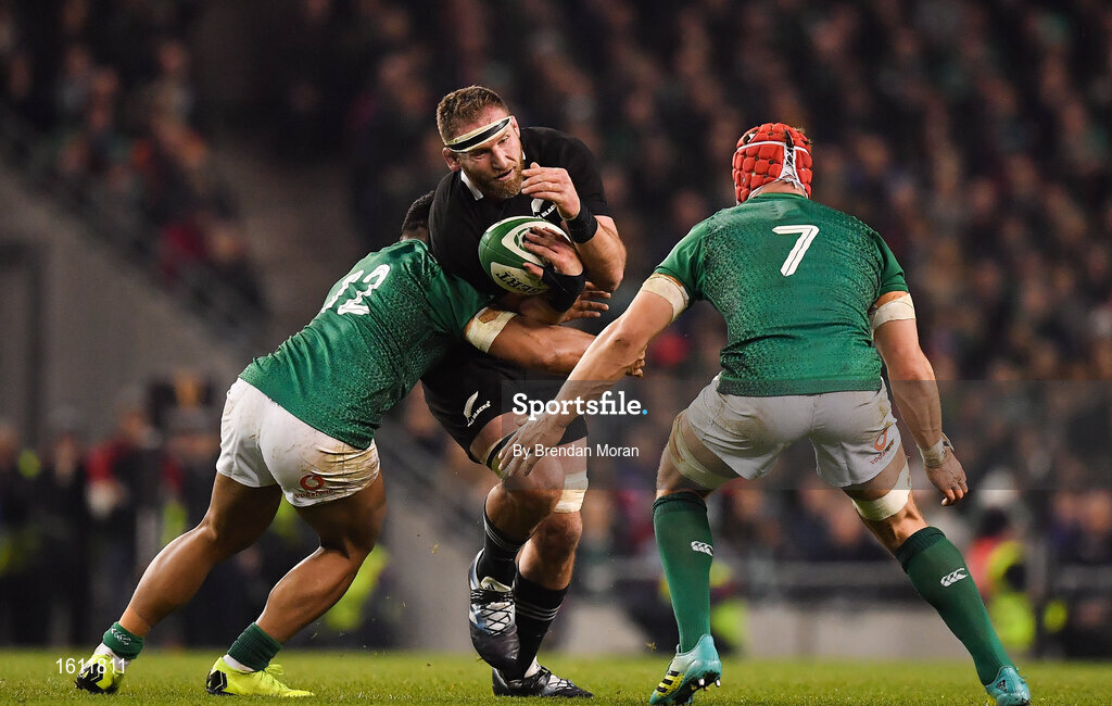 17 November 2018; Kieran Read of New Zealand is tackled by Bundee Aki, left, and Josh van der Flier of Ireland during the Guinness Series International match between Ireland and New Zealand at the Aviva Stadium in Dublin. Photo by Brendan Moran/Sportsfile