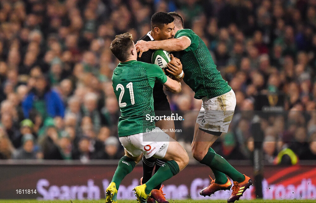 17 November 2018; Richie Mo'unga of New Zealand is tackled by Luke McGrath and Jonathan Sexton of Ireland during the Guinness Series International match between Ireland and New Zealand at the Aviva Stadium in Dublin. Photo by Brendan Moran/Sportsfile
