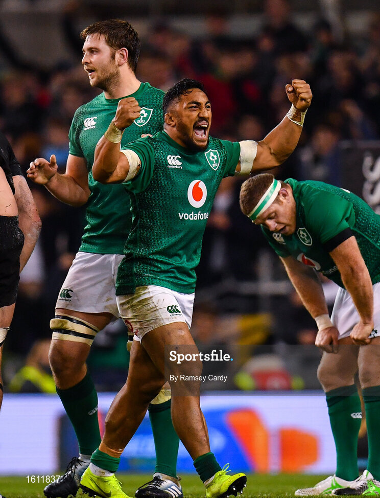 17 November 2018; Bundee Aki of Ireland celebrates at the final whistle of the Guinness Series International match between Ireland and New Zealand at the Aviva Stadium in Dublin. Photo by Ramsey Cardy/Sportsfile