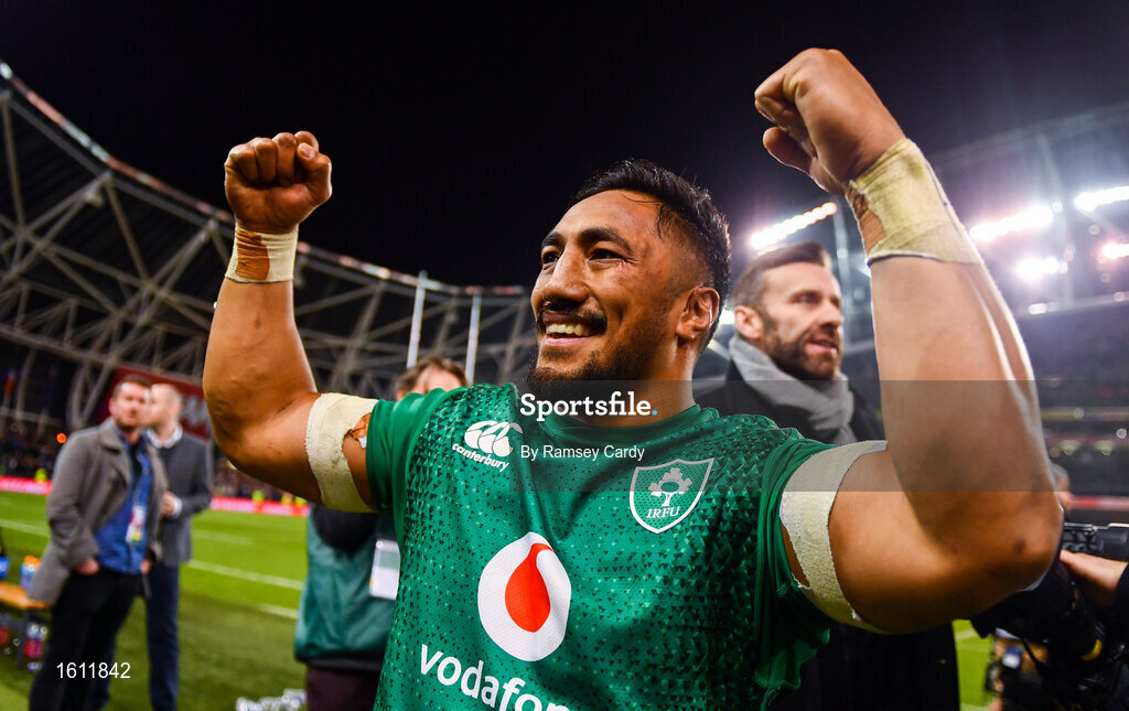 17 November 2018; Bundee Aki of Ireland celebrates following his side's victory in the Guinness Series International match between Ireland and New Zealand at the Aviva Stadium in Dublin. Photo by Ramsey Cardy/Sportsfile