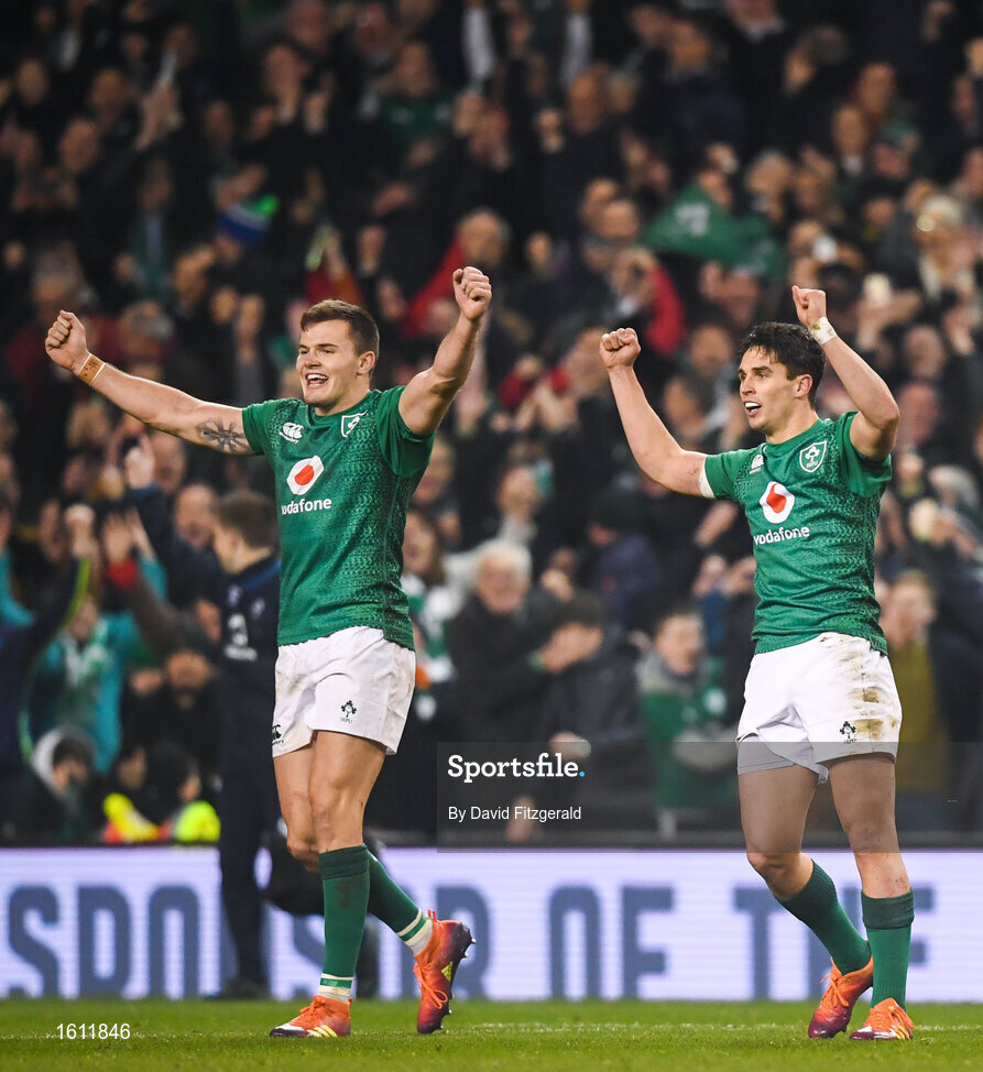 17 November 2018; Jacob Stockdale, left, and Joey Carbery of Ireland celebrate at the final whistle following the Guinness Series International match between Ireland and New Zealand at the Aviva Stadium in Dublin. Photo by David Fitzgerald/Sportsfile
