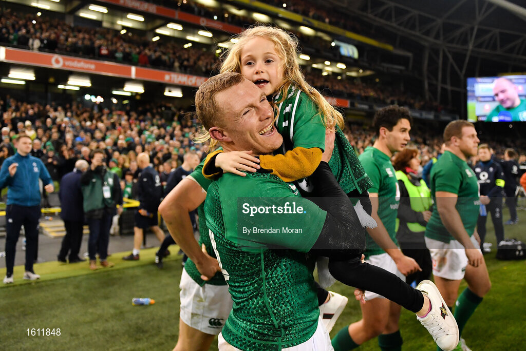 17 November 2018; Keith Earls of Ireland celebrates with his daughter Ella May following the Guinness Series International match between Ireland and New Zealand at the Aviva Stadium in Dublin. Photo by Brendan Moran/Sportsfile