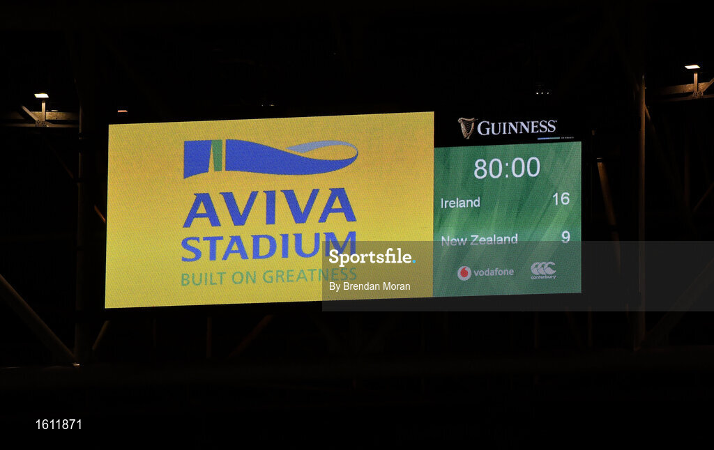 17 November 2018; The final scoreboard following the Guinness Series International match between Ireland and New Zealand at the Aviva Stadium in Dublin. Photo by Brendan Moran/Sportsfile