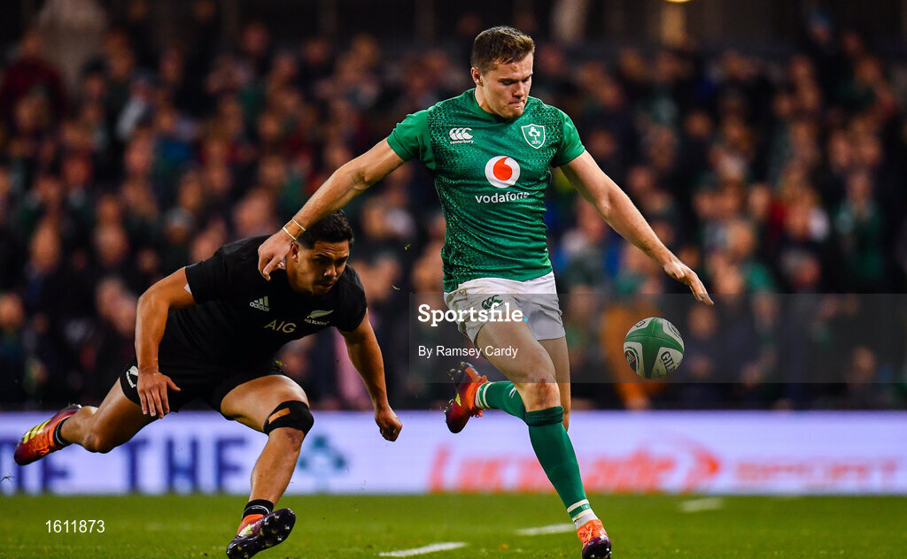 17 November 2018; Jacob Stockdale of Ireland in action against Anton Lienert-Brown of New Zealand during the Guinness Series International match between Ireland and New Zealand at the Aviva Stadium in Dublin. Photo by Ramsey Cardy/Sportsfile