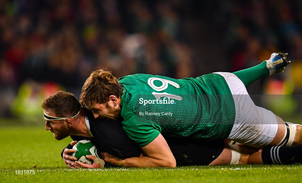 17 November 2018; Kieran Read of New Zealand is tackled by Iain Henderson of Ireland during the Guinness Series International match between Ireland and New Zealand at the Aviva Stadium in Dublin. Photo by Ramsey Cardy/Sportsfile