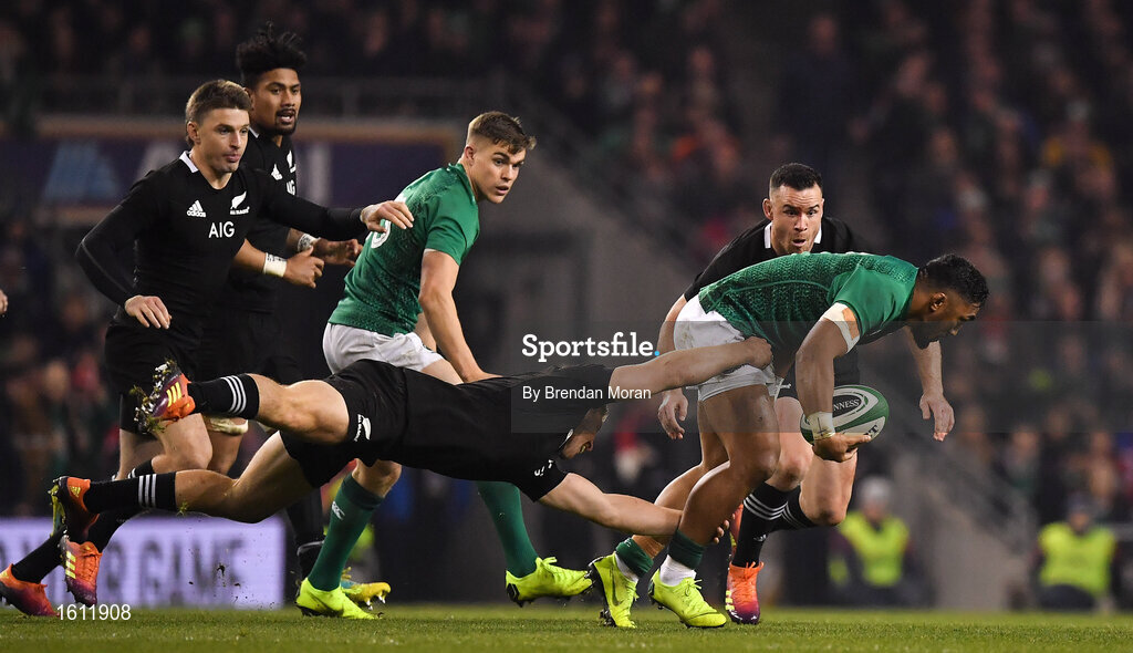 17 November 2018; Bundee Aki of Ireland breaks away from Jack Goodhue of New Zealand during the Guinness Series International match between Ireland and New Zealand at Aviva Stadium, Dublin. Photo by Brendan Moran/Sportsfile