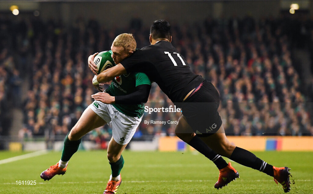 17 November 2018; Keith Earls of Ireland is tackled by Rieko Ioane of New Zealand during the Guinness Series International match between Ireland and New Zealand at the Aviva Stadium in Dublin. Photo by Ramsey Cardy/Sportsfile
