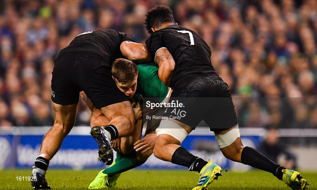 17 November 2018; Garry Ringrose of Ireland is tackled by Kieran Read, left, and Ardie Savea of New Zealand during the Guinness Series International match between Ireland and New Zealand at the Aviva Stadium in Dublin. Photo by Ramsey Cardy/Sportsfile