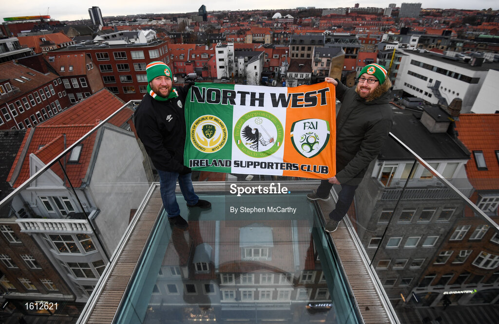 19 November 2018; Republic of Ireland supporters, Graham Hayes, left, and Alan Dunbar, from Sligo, prior to the UEFA Nations League B match between Denmark and Republic of Ireland at Ceres Park in Aarhus, Denmark. Photo by Stephen McCarthy/Sportsfile