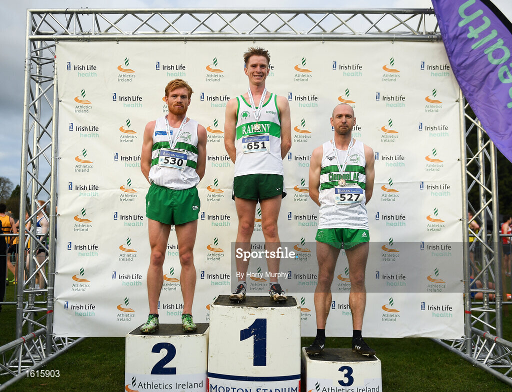 25 November 2018; Race winner Kevin Dooney of Raheny Shamrock A.C., centre, with second place Sean Tobin, left and Kevin Maunsell, right, of Clonmel A.C. after the Senior Men's 10,000m during the Irish Life Health National Senior & Junior Cross Country Championships at National Sports Campus in Abbottstown, Dublin. Photo by Harry Murphy/Sportsfile