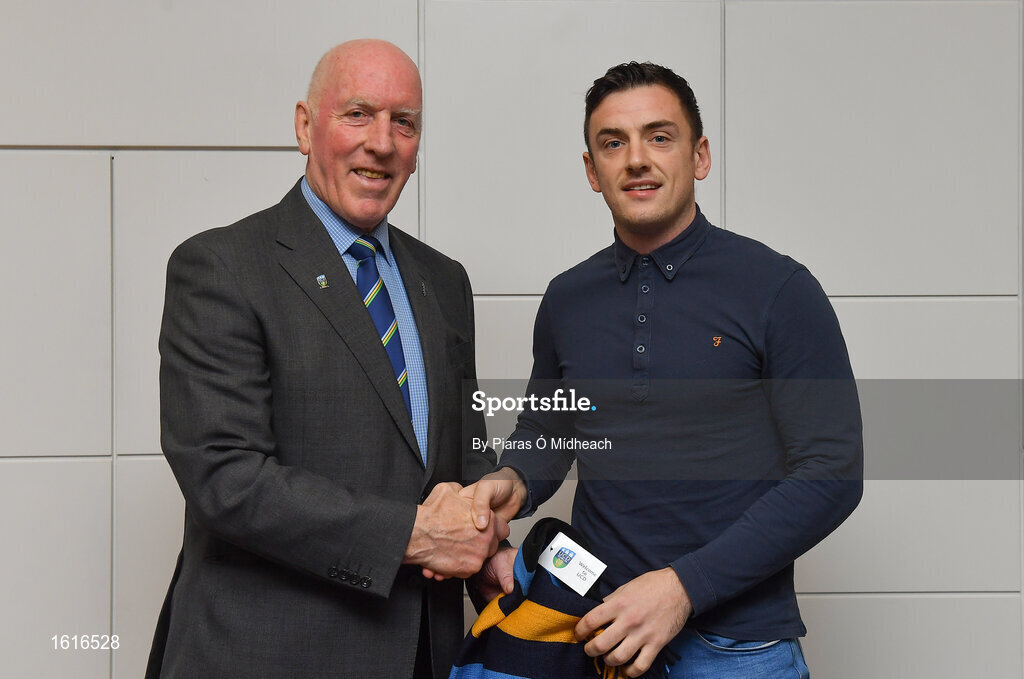26 November 2018; Brian Mullins, Director of Sport, UCD, presents footballer Gary Walshe of Ballylinan and Laois with a UCD scarf during the UCD GAA Sports Scholarship Presentation 2018/2019 at UCD in Dublin. Photo by Piaras Ó Mídheach/Sportsfile