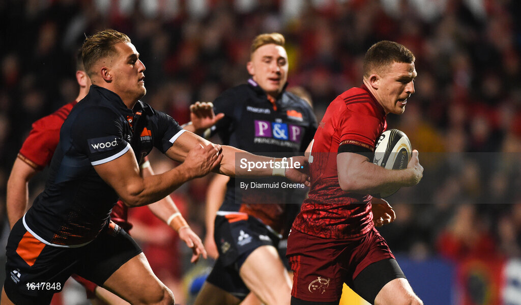 30 November 2018; Andrew Conway of Munster gets away from Dougie Fife of Edinburgh on his way to scoring his side's second try during the Guinness PRO14 Round 10 match between Munster and Edinburgh at Irish Independent Park in Cork. Photo by Diarmuid Greene/Sportsfile