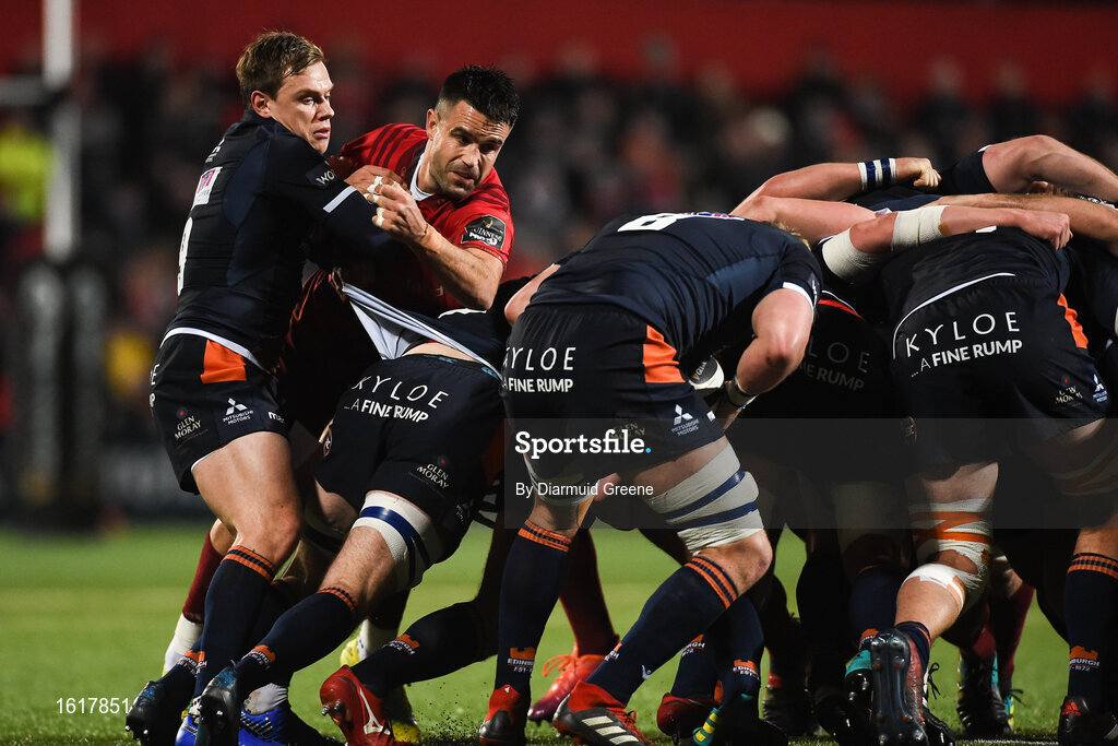 30 November 2018; Conor Murray of Munster competes with Nathan Fowles of Edinburgh during a scrum in the Guinness PRO14 Round 10 match between Munster and Edinburgh at Irish Independent Park in Cork. Photo by Diarmuid Greene/Sportsfile