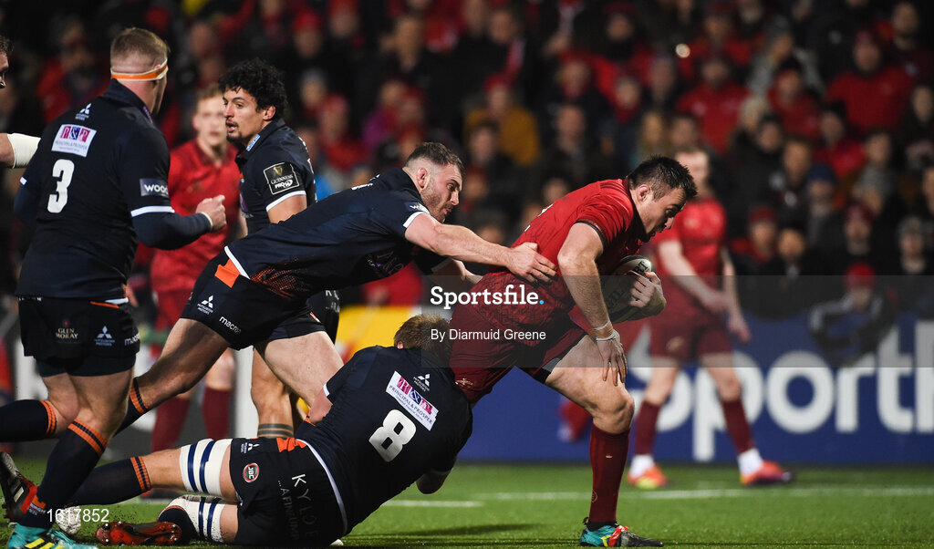 30 November 2018; Niall Scannell of Munster is tackled by David Cherry and Luke Hamilton of Edinburgh during the Guinness PRO14 Round 10 match between Munster and Edinburgh at Irish Independent Park in Cork. Photo by Diarmuid Greene/Sportsfile