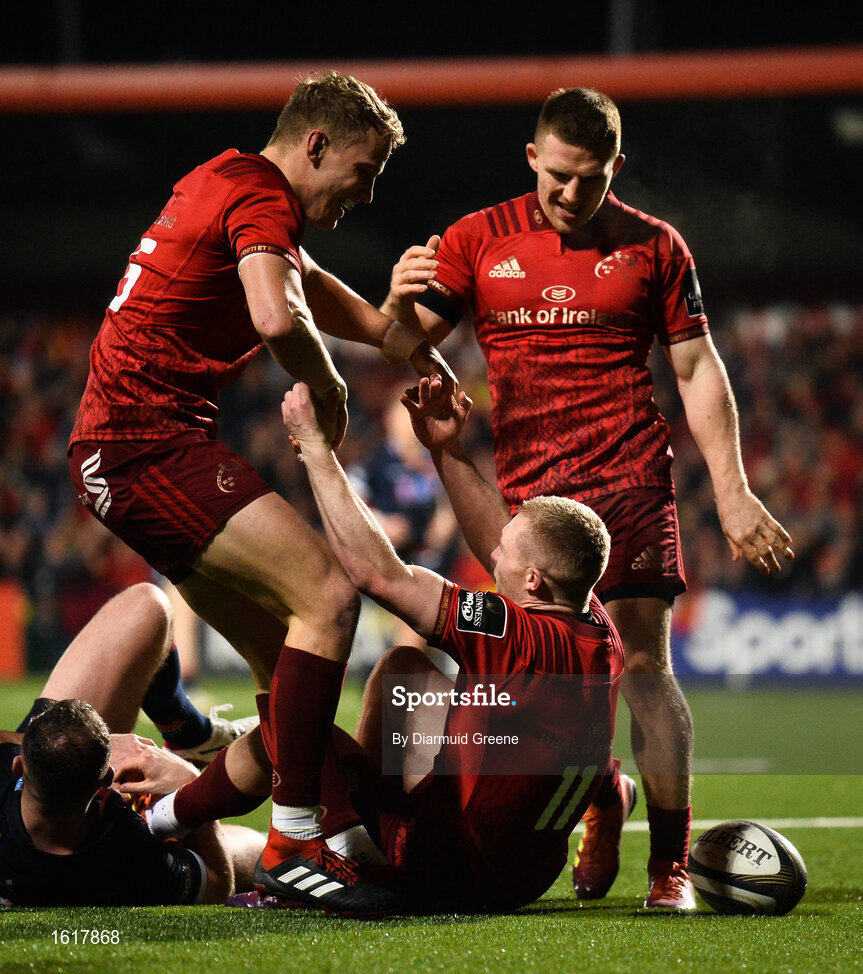 30 November Keith Earls of Munster is congratulated by team-mates Mike Haley, and Andrew Conway after scoring his second try of the game during the Guinness PRO14 Round 10 match between Munster and Edinburgh at Irish Independent Park in Cork. Photo by Diarmuid Greene/Sportsfile