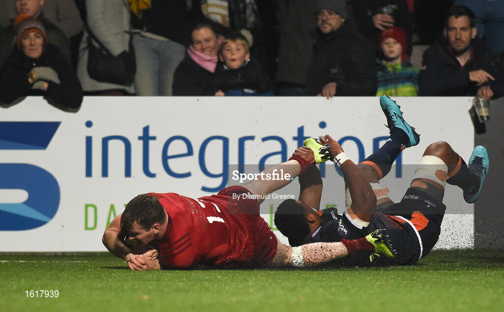 30 November 2018; Chris Farrell of Munster scores his side's last try of the game despite the efforts of Senitiki Nayalo of Edinburgh during the Guinness PRO14 Round 10 match between Munster and Edinburgh at Irish Independent Park in Cork. Photo by Diarmuid Greene/Sportsfile