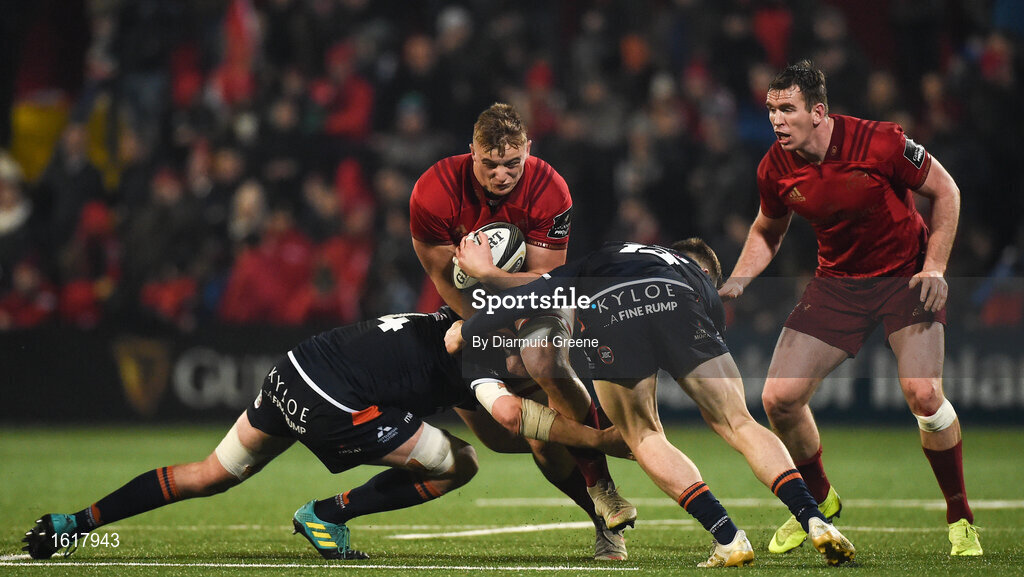 30 November 2018; Gavin Coombes of Munster, supported by team-mate Chris Farrell, is tackled by Jamie Hodgson and George Daly of Edinburgh during the Guinness PRO14 Round 10 match between Munster and Edinbugh at Irish Independent Park in Cork. Photo by Diarmuid Greene/Sportsfile