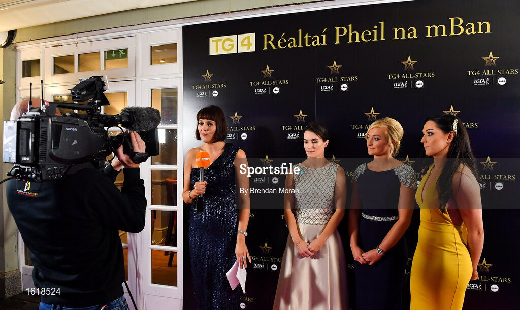 1 December 2018; Dublin players from left, Sinéad Aherne, Carla Rowe and Sinéad Goldrick speaking with Gráinne McElwain of TG4 during a Facebook Live show prior to the TG4 All Star awards during the TG4 Ladies Football All Stars Awards 2018, in association with Lidl, at the Citywest Hotel in Dublin. Photo by Brendan Moran/Sportsfile