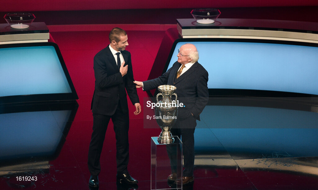 2 December 2018; UEFA President Aleksander Ceferin, left, and President of Ireland Michael D Higgins with the Henri Delaunay Trophy following the UEFA EURO2020 Qualifying Draw at the Convention Centre in Dublin. Photo by Sam Barnes/Sportsfile