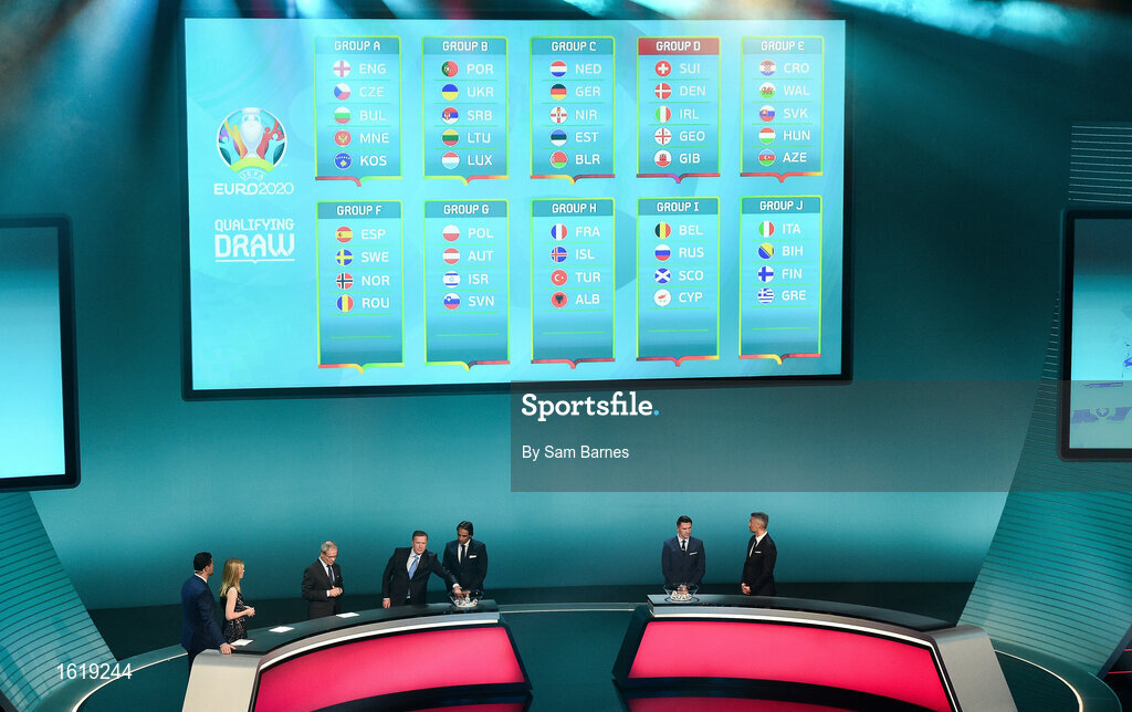 2 December 2018; A view of the groups and panel as Former Republic of Ireland international Ronnie Whelan pulls a ball from the pot during the UEFA EURO2020 Qualifying Draw at the Convention Centre in Dublin. Photo by Sam Barnes/Sportsfile