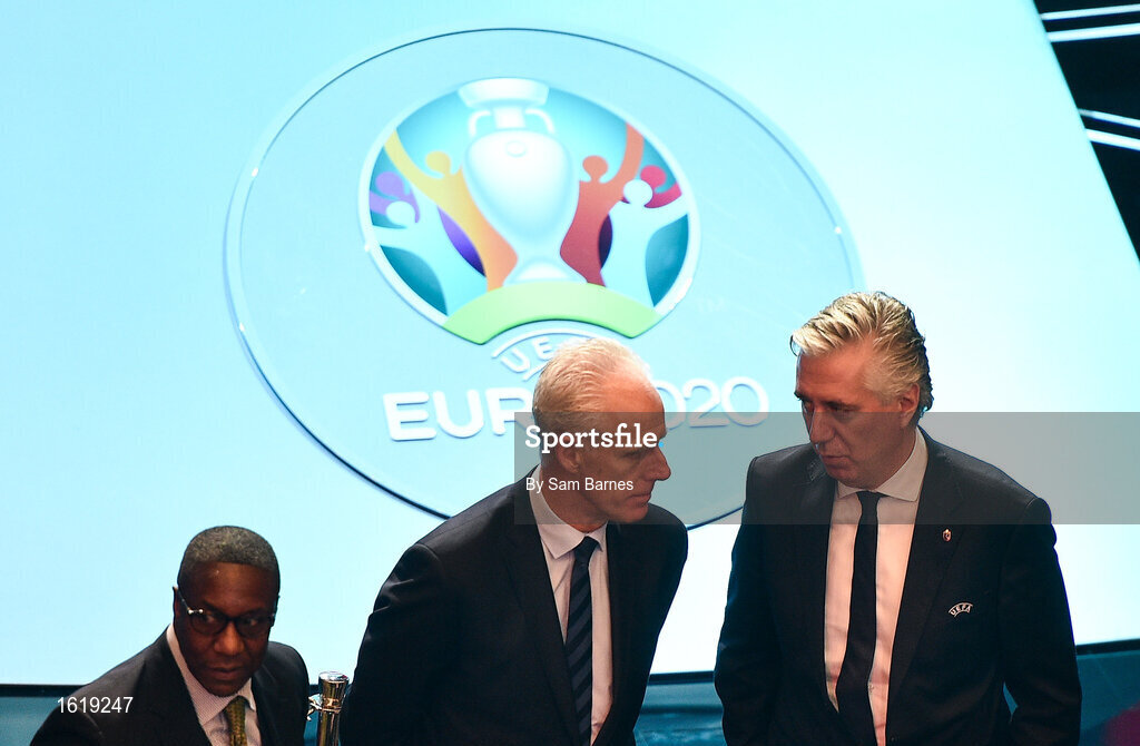 2 December 2018; Republic of Ireland assistant manager Terry Connor, left, manager Mick McCarthy, centre, and John Delaney, CEO, Football Association of Ireland following the UEFA EURO2020 Qualifying Draw at the Convention Centre in Dublin. Photo by Sam Barnes/Sportsfile