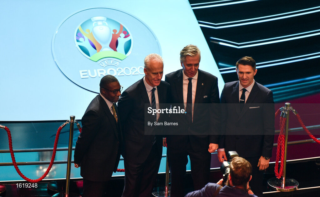 2 December 2018; From left, Republic of Ireland assistant coach Terry Connor, Republic of Ireland manager Mick McCarthy, John Delaney, CEO, Football Association of Ireland and Republic of Ireland assistant coach Robbie Keane, pose for a photograph following the UEFA EURO2020 Qualifying Draw at the Convention Centre in Dublin. Photo by Sam Barnes/Sportsfile