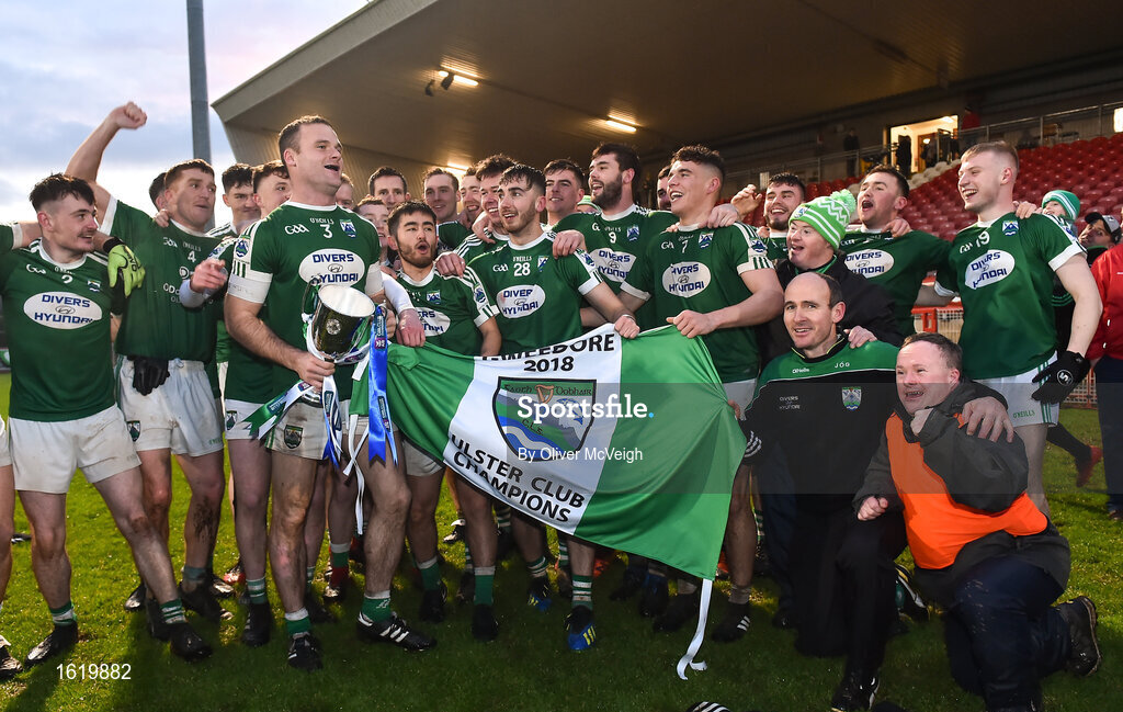 2 December 2018; Gaoth Dobhair players celebrate the Seamus McFerran cup after the AIB Ulster GAA Football Senior Club Championship Final match between Gaoth Dobhair and Scotstown at Healy Park in Tyrone. Photo by Oliver McVeigh/Sportsfile