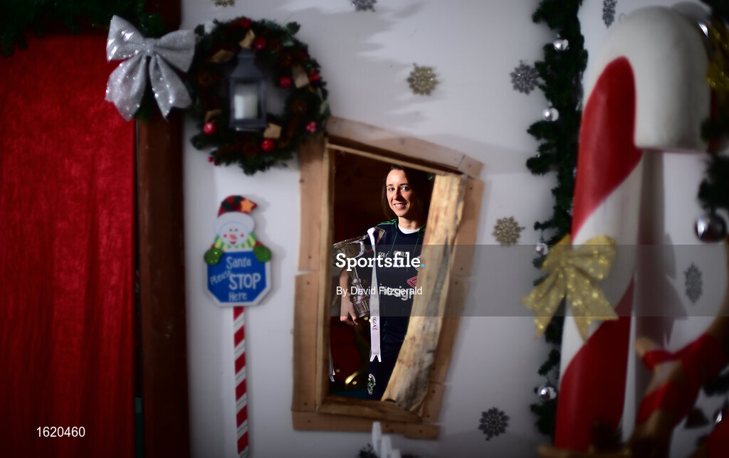 4 December 2018; Amy Ring, captain of Foxrock-Cabinteely, with the Dolores Tyrrell Memorial Cup ahead of the Senior Ladies All-Ireland Club Final, during the 2018 All-Ireland Ladies Club Football Finals Captains Day at Croke Park in Dublin. Photo by David Fitzgerald/Sportsfile