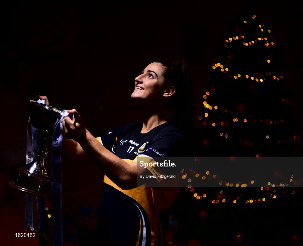 4 December 2018; Eimear Meaney of Mourneabbey with the Dolores Tyrrell Memorial Cup ahead of the Senior Ladies All-Ireland Club Final, during the 2018 All-Ireland Ladies Club Football Finals Captains Day at Croke Park in Dublin. Photo by David Fitzgerald/Sportsfile