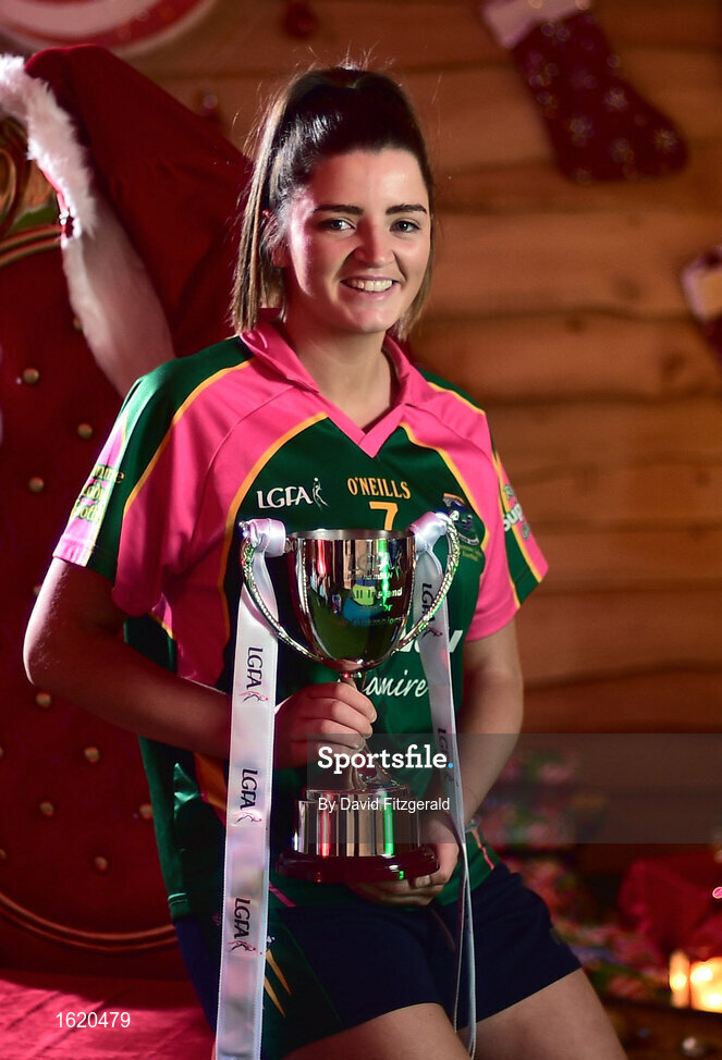 4 December 2018; Amy Turpin, captain of Glanmire, with the Ladies All-Ireland Junior Club Championship Perpetual Cup during the 2018 All-Ireland Ladies Club Football Finals Captains Day at Croke Park in Dublin. Photo by David Fitzgerald/Sportsfile