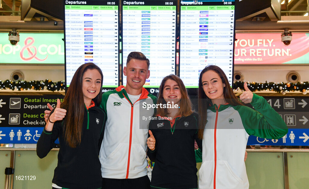 7 December 2018; Adam's State University alumni Kevin Batt and current students, from left, Roisin Flanagan, Stephanie Cotter, Eilish Flanagan, pictured at Dublin Airport prior to departing for the European Cross Country in Beekse Bergen Safari Park in Tilburg, Netherlands. Photo by Sam Barnes/Sportsfile