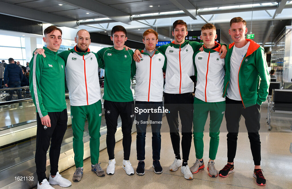 7 December 2018; Team Ireland athletes, from left, Brian Fay, Kevn Maunsell, Garry Campbell, Sean Tobin, Paul Robinson, Daire Finn, Kevin Batt, pictured at Dublin Airport prior to departing for the European Cross Country in Beekse Bergen Safari Park in Tilburg, Netherlands. Photo by Sam Barnes/Sportsfile
