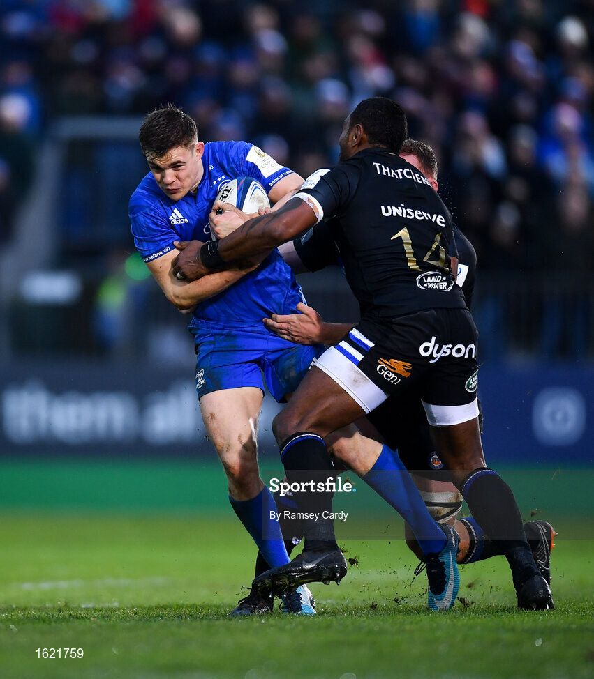8 December 2018; Garry Ringrose of Leinster is tackled by Sam Underhill, left, and Semesa Rokoduguni of Bath during the European Rugby Champions Cup Pool 1 Round 3 match between Bath and Leinster at the Recreation Ground in Bath, England. Photo by Ramsey Cardy/Sportsfile