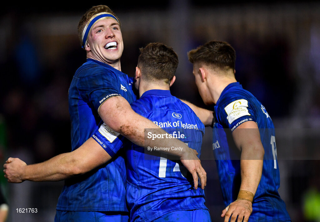 8 December 2018; Dan Leavy of Leinster congratulates teammate Jordan Larmour after he scored his side's second try during the European Rugby Champions Cup Pool 1 Round 3 match between Bath and Leinster at the Recreation Ground in Bath, England. Photo by Ramsey Cardy/Sportsfile