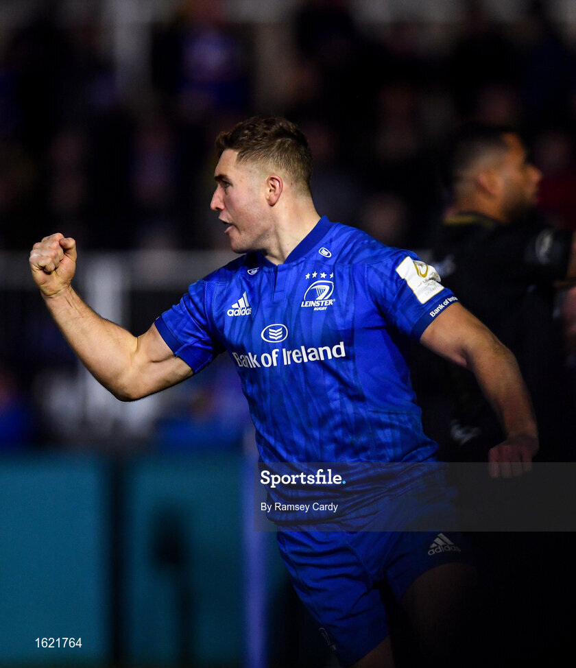 8 December 2018; Jordan Larmour of Leinster celebrates after scoring his side's second try during the European Rugby Champions Cup Pool 1 Round 3 match between Bath and Leinster at the Recreation Ground in Bath, England. Photo by Ramsey Cardy/Sportsfile