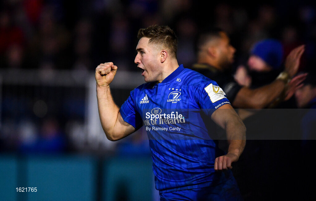 8 December 2018; Jordan Larmour of Leinster celebrates after scoring his side's second try during the European Rugby Champions Cup Pool 1 Round 3 match between Bath and Leinster at the Recreation Ground in Bath, England. Photo by Ramsey Cardy/Sportsfile