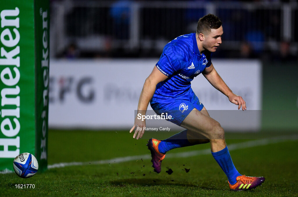 8 December 2018; Jordan Larmour of Leinster goes over to score his side's second try during the European Rugby Champions Cup Pool 1 Round 3 match between Bath and Leinster at the Recreation Ground in Bath, England. Photo by Ramsey Cardy/Sportsfile