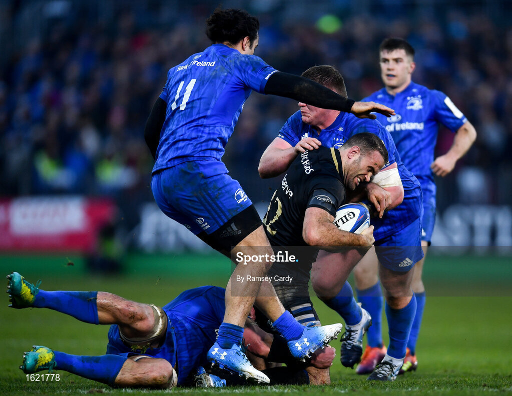 8 December 2018; Jamie Roberts of Bath is tackled by Leinster players, from left, Rhys Ruddock, James Lowe, and Tadhg Furlong during the European Rugby Champions Cup Pool 1 Round 3 match between Bath and Leinster at the Recreation Ground in Bath, England. Photo by Ramsey Cardy/Sportsfile