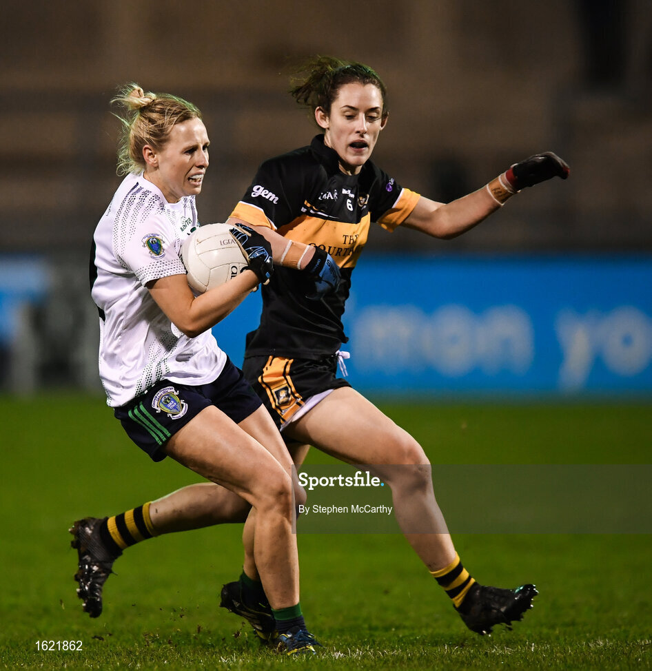 8 December 2018; Fiona Claffey of Foxrock-Cabinteely in action against Róisín O'Sullivan of Mourneabbey during the All-Ireland Ladies Football Senior Club Championship Final match between Foxrock-Cabinteely, Dublin, and Mourneabbey, Cork, at Parnell Park in Dublin. Photo by Stephen McCarthy/Sportsfile