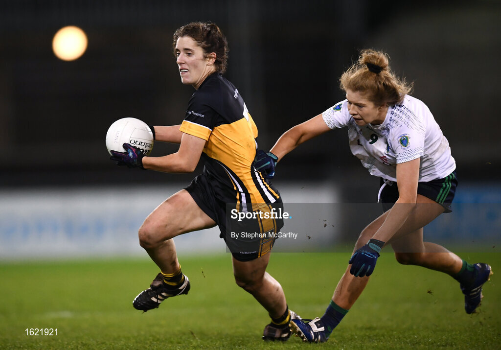 8 December 2018; Ciara O'Sullivan of Mourneabbey in action against Ciara Ní Mhurchadh of Foxrock-Cabinteely during the All-Ireland Ladies Football Senior Club Championship Final match between Mourneabbey and Foxrock-Cabinteely at Parnell Park in Dublin. Photo by Stephen McCarthy/Sportsfile